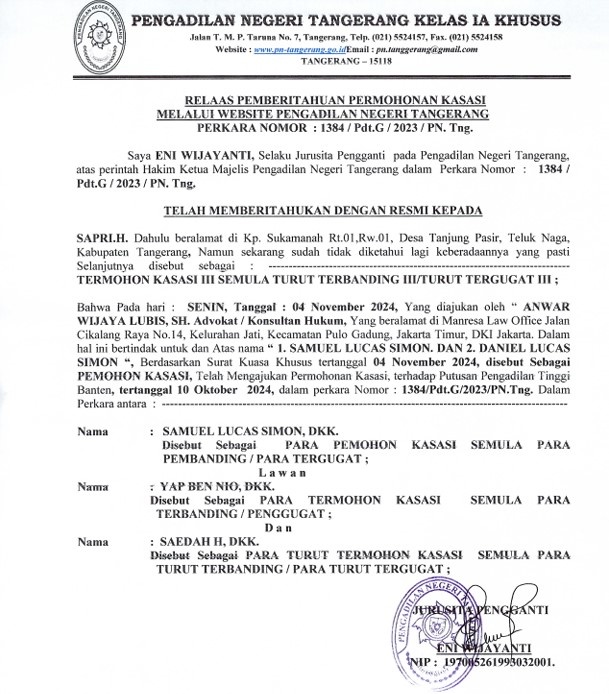 RELAAS PEMBERITAHUAN PERMOHONAN KASASI NOMOR 1384/Pdt.G/2023/PN Tng