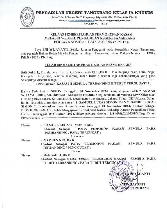 RELAAS PEMBERITAHUAN PERMOHONAN KASASI NOMOR 1384/Pdt.G/2023/PN Tng KEPADA TERMOHON KASASI II