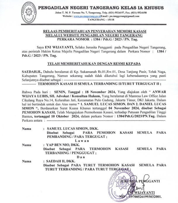 RELAAS PEMBERITAHUAN PENYERAHAN MEMORI KASASI NOMOR 1384/Pdt.G/2023/PN Tng KEPADA TERMOHON KASASI II