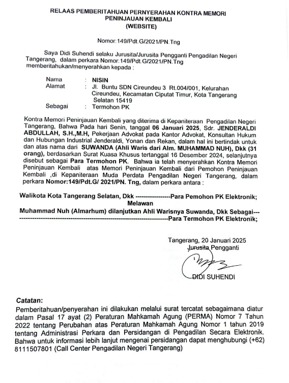 RELAAS PEMBERITAHUAN PENYERAHAN KONTRA MEMORI PENINJAUAN KEMBALI KEPADA TERMOHON PK NO. 149/Pdt.G/2021/PN Tng