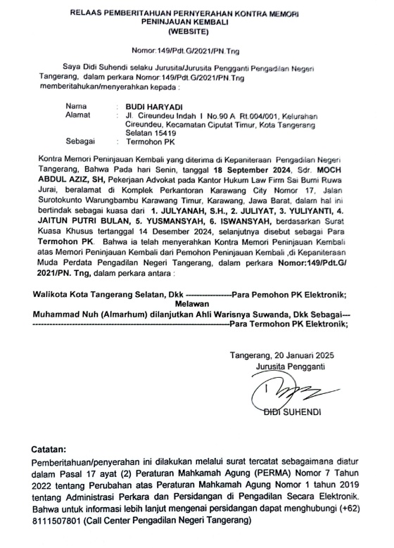 RELAAS PEMBERITAHUAN PENYERAHAN KONTRA MEMORI PENINJAUAN KEMBALI KEPADA TERMOHON PK NO. 149/Pdt.G/2021/PN Tng