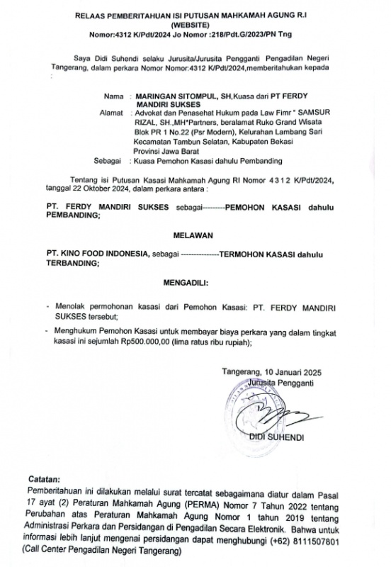 RELAAS PEMBERITAHUAN ISI PUTUSAN MAHKAMAH AGUNG RI KEPADA KUASA PEMOHON KASASI DAHULU PEMBANDING NO. 4312 K/Pdt/2024 Jo NO 218/Pdt.G/2023/PN Tng