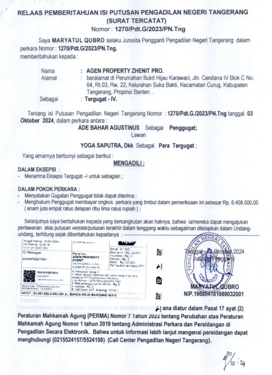 RELAAS PEMBERITAHUAN ISI PUTUSAN KEPADA TERGUGAT IV NO. 1270/Pdt.G/2023/PN Tng