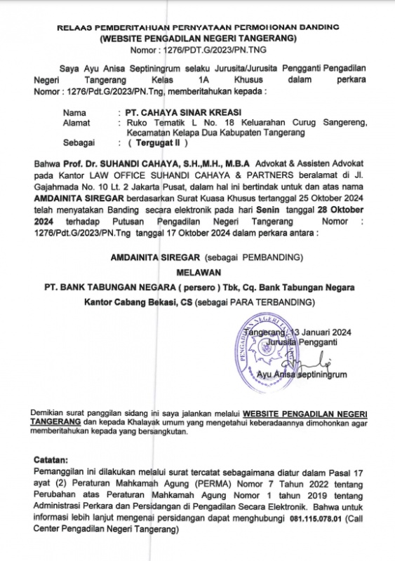 RELAAS PEMBERITAHUAN PERNYATAAN PERMOHONAN BANDING KEPADA TERGUGAT II NO. 1276/Pdt.G/2023/PN Tng