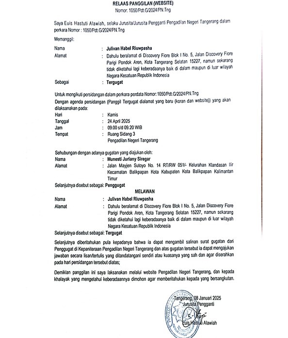 RELAAS PANGGILAN 1050/Pdt.G/2024/PN Tng