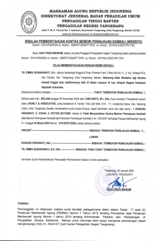 RELAAS PEMBERITAHUAN KONTRA MEMORI PENINJAUAN KEMBALI Nomor : 521/Pdt.G/2021/PN.Tng (Pemohon PK An. VINCENT)
