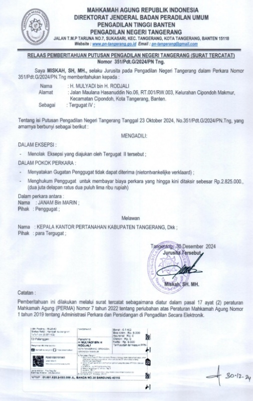 RELAAS PEMBERITAHUAN PUTUSAN PENGADILAN NEGERI TANGERANG KEPADA TERGUGAT IV NO. 351/Pdt.G/2024/PN Tng