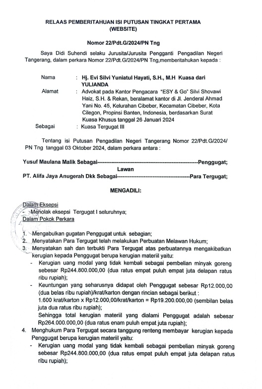 RELAAS PEMBERITAHUAN ISI PUTUSAN TINGKAT PERTAMA KEPADA KUASA TERGUGAT III NO. 22/Pdt.G/2024/PN Tng