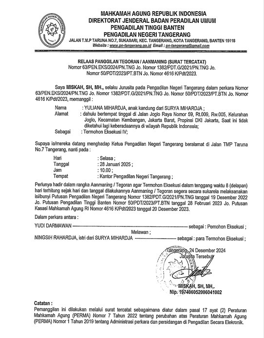 RELAAS PANGGILAN TEGURAN/AANMANING NOMOR 53/PEN.EKS/2024/PN Tng kepada Termohon Eksekusi IV