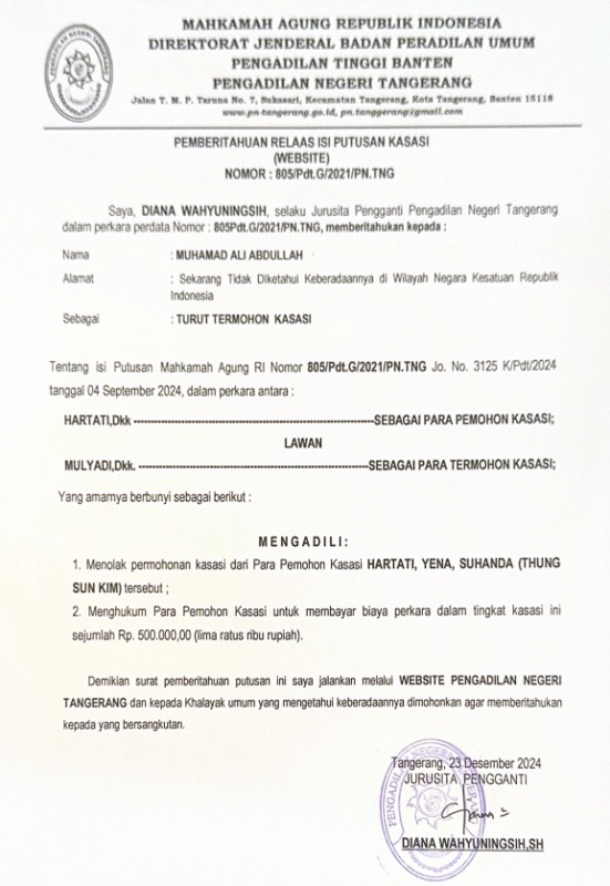 PEMBERITAHUAN RELAAS ISI PUTUSAN KASASI KEPADA TURUT TERMOHON KASASI NO. 805/Pdt.G/2021/PN Tng