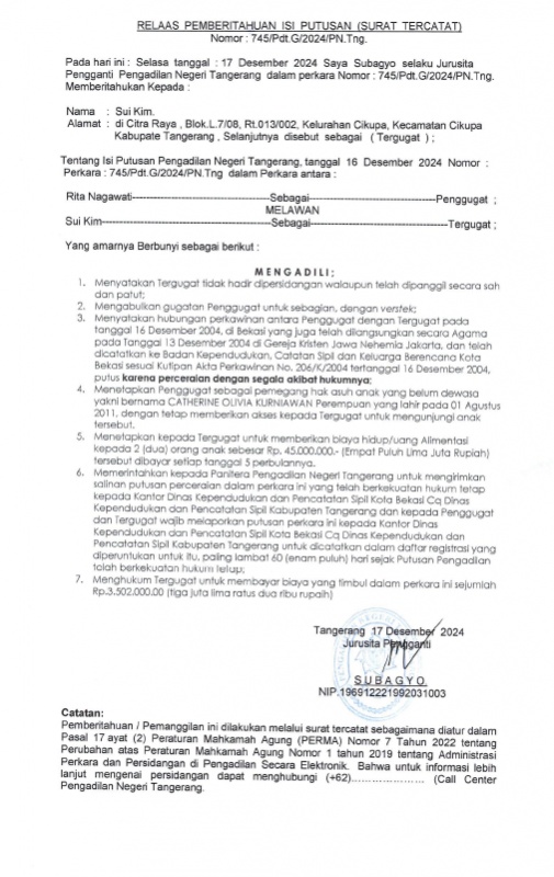 RELAAS PEMBERITAHUAN ISI PUTUSAN NOMOR 745/PDT.G/2024/PN TNG KEPADA TERGUGAT