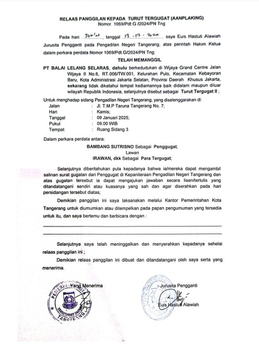 RELAAS PANGGILAN KEPADA TURUT TERGUGAT (AANPLAKING) NOMOR 1069/Pdt.G/2024/PN Tng
