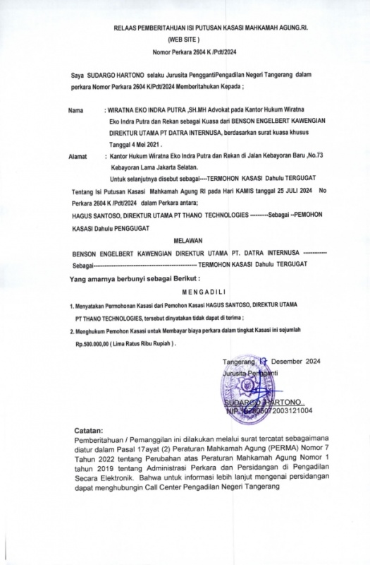 RELAAS PEMBERITAHUAN ISI PUTUSAN TINGKAT KASASI 1124/Pdt.G/2020/PN Tng (AN. DIREKTUR UTAMA PT. DATRA INTERNUSA)