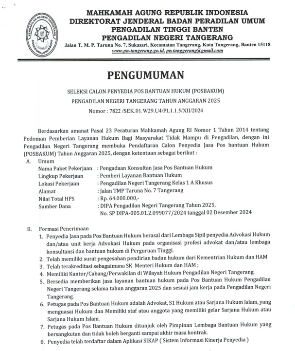 SELEKSI CALON PENYEDIA POS BANTUAN HUKUM (POSBAKUM) PENGADILAN NEGERI TANGERANG TAHUN ANGGARAN 2025