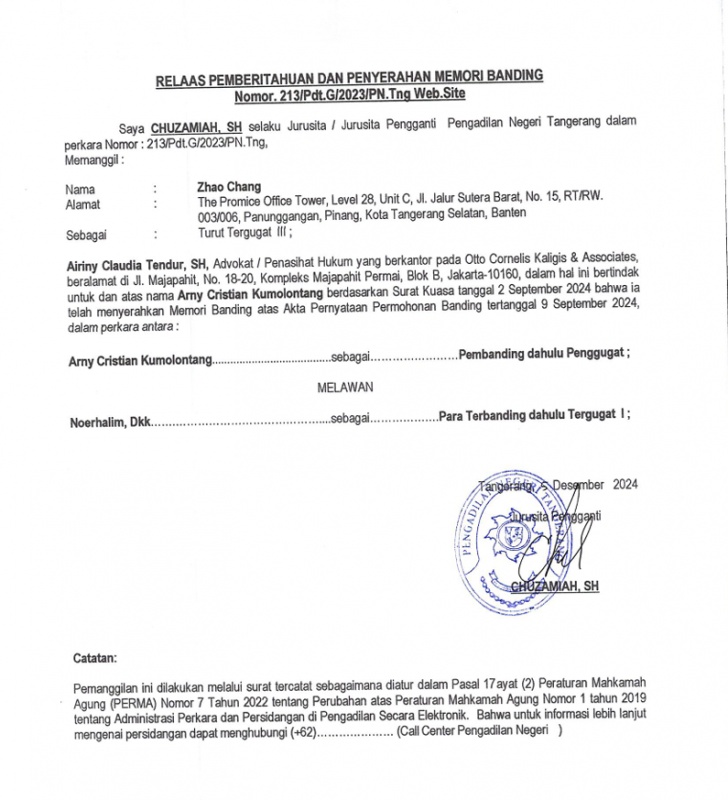 RELAAS PEMBERITAHUAN DAN PENYERAHAN MEMORI BANDING KEPADA TURUT TERBANDING III NOMOR 213 PDT.G 2023 PN TNG