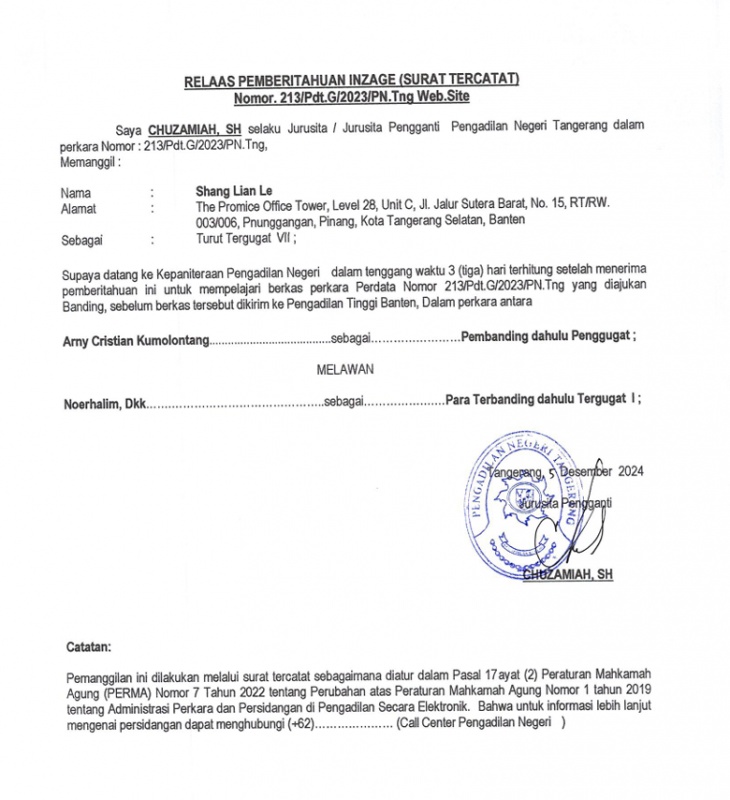 RELAAS PEMBERITAHUAN INZAGE (SURAT TERCATAT) KEPADA TURUT TERBANDING VII NOMOR 213 PDT.G 2023 PN TNG