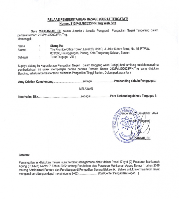 RELAAS PEMBERITAHUAN INZAGE (SURAT TERCATAT) KEPADA TURUT TERBANDING VIII NOMOR 213 PDT.G 2023 PN TNG