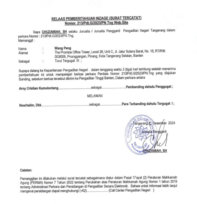 RELAAS PEMBERITAHUAN INZAGE (SURAT TERCATAT) KEPADA TURUT TERBANDING IX NOMOR 213 PDT.G 2023 PN TNG