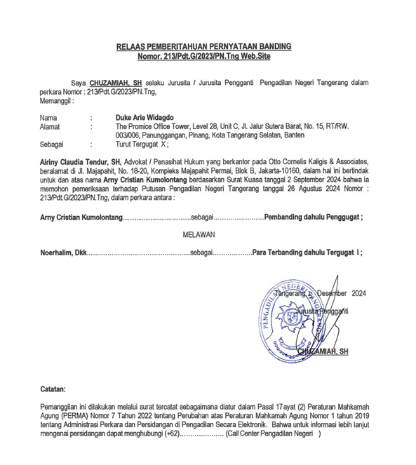 RELAAS PEMBERITAHUAN PERNYATAAN BANDING KEPADA TURUT TERBANDING X NOMOR 213/PDT.G/2023/PN TNG