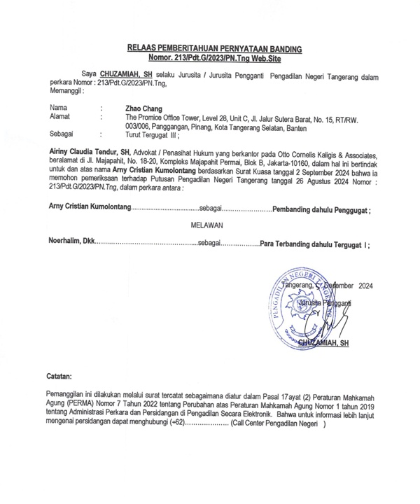 RELAAS PEMBERITAHUAN PERNYATAAN BANDING KEPADA TURUT TERBANDING III NOMOR 213/PDT.G/2023/PN TNG