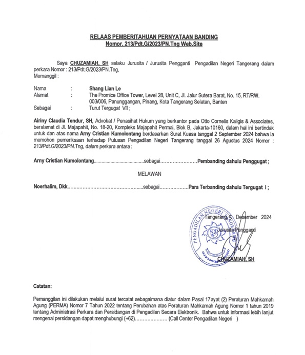 RELAAS PEMBERITAHUAN PERNYATAAN BANDING KEPADA TURUT TERBANDING VII NOMOR 213/PDT.G/2023/PN TNG
