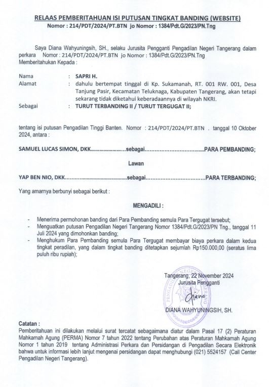 RELAAS PEMBERITAHUAN ISI PUTUSAN TINGKAT BANDING KEPADA TURUT TERBANDING II / TURUT TERGUGAT II NO. 214/PDT/2024 jo NO. 1384/Pdt.G/2023/PN Tng