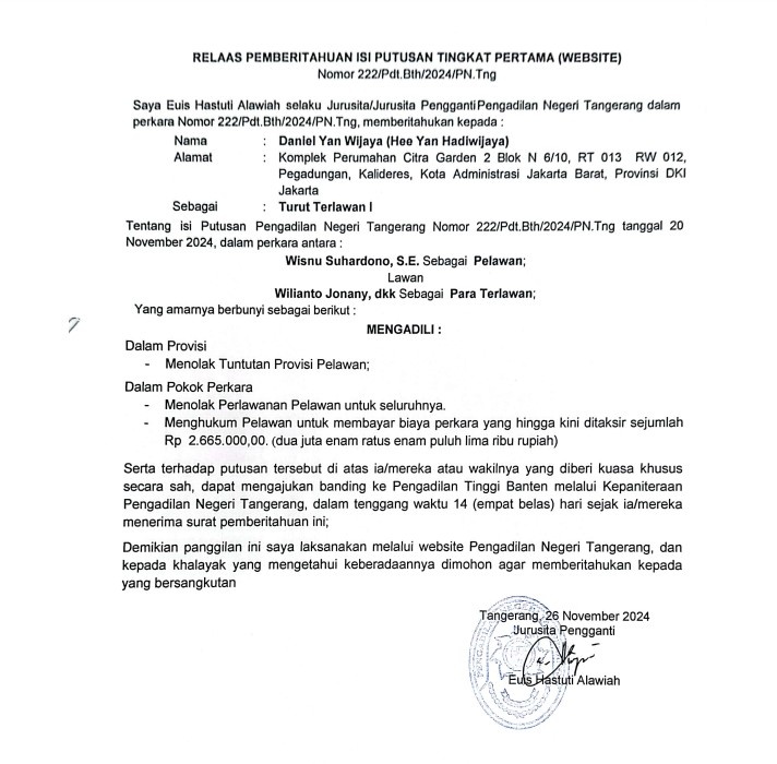 RELAAS PEMBERITAHUAN ISI PUTUSAN TINGKAT PERTAMA 222/Pdt.Bth/2024/PN Tng