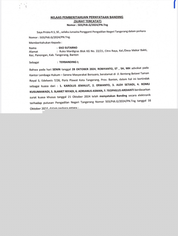 RELAAS PEMBERITAHUAN PERNYATAAN BANDING Nomor : 503/Pdt.G/2023/PN Tng