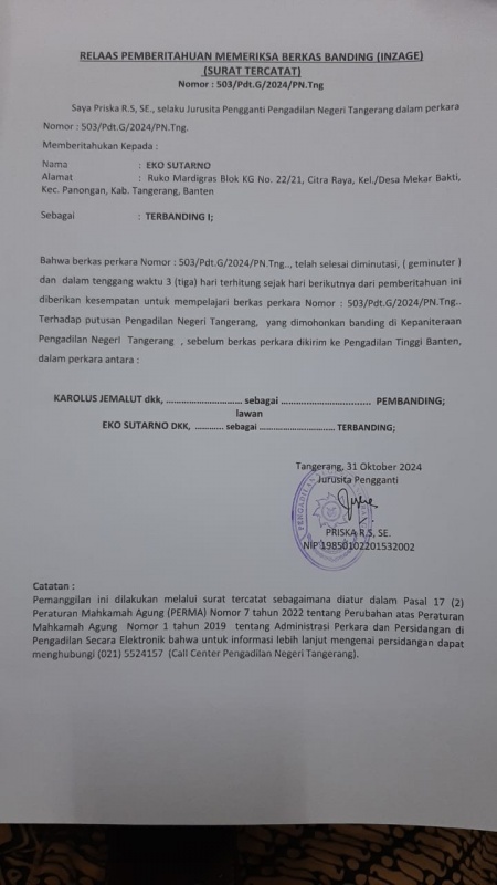 RELAAS MEMERIKSA BERKAS BANDING Nomor : 503/Pdt.G/2023/PN Tng