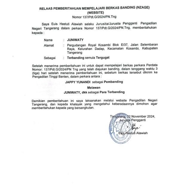 RELAAS PEMBERITAHUAN MEMPELAJARI BERKAS BANDING (INZAGE) NOMOR 137/Pdt.G/2024/PN Tng