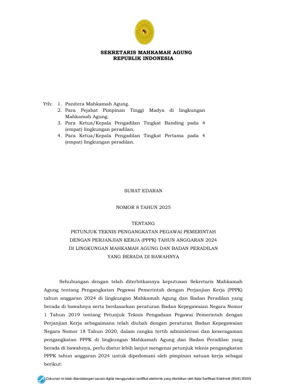 SURAT EDARAN SEKRETARIS MAHKAMAH AGUNG RI NOMOR 8 TAHUN 2025 TENTANG PETUNJUK TEKNIS PENGANGKATAN PEGAWAI PEMERINTAH DENGAN PERJANJIAN KERJA (PPPK) TAHUN ANGGARAN 2024 DI LINGKUNGAN MAHKAMAH AGUNG RI DAN BADAN PERADILAN DI BAWAHNYA