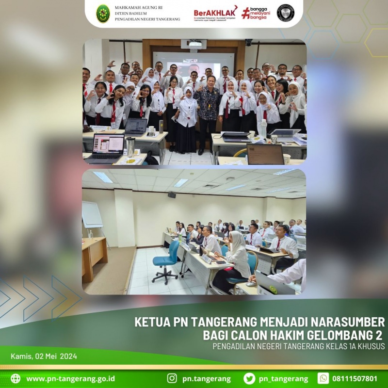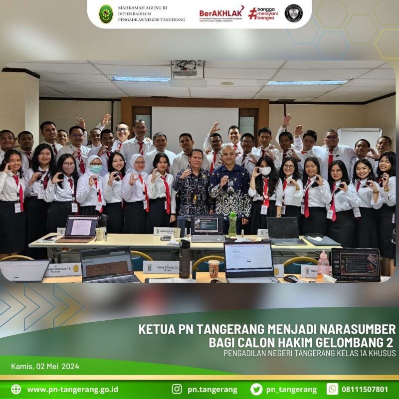 Bertempat di Gedung Badan Strategi Kebijakan dan Diklat Kumdil Jl. Cikopo Selatan, Gadog, Desa Sukamaju, Kec. Megamendung, Kab. Bogor, Jawa Barat. Dalam kesempatan ini Ketua Pengadilan Negeri Tangerang Kelas 1A Khusus Bapak Dr. Fahmiron S.H., M.Hum,. hadir sebagai narasumber bagi Calon Hakim, Program Pendidikan Calon Hakim (PPCH) gelombang 2.
