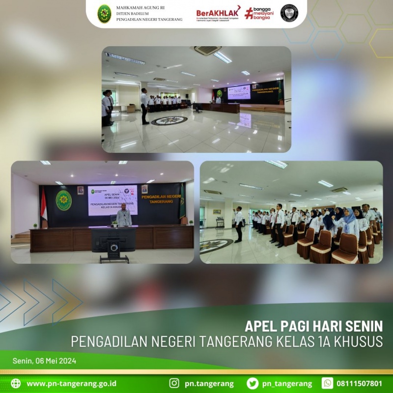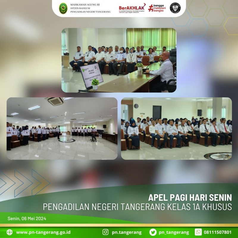 Mengawali aktifitas di hari Senin awal bulan bertempat di ruang aula lantai. 5, kali ini Bapak Achmad Irfir R, S.H., M.H., bertidak sebagai pembina apel. Apel pagi diikuti oleh Seluruh Bapak/Ibu Hakim serta pegawai Pengadilan Negeri Tangerang Kelas 1A Khusus.