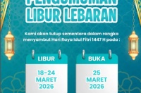 Sehubungan dengan perayaan Hari Raya Idul Fitri, pelayanan di Pengadilan Negeri Tangerang akan *tutup sementara pada tanggal 18 – 24 Maret 2026* dan akan *kembali buka pada tanggal 25 Maret .......