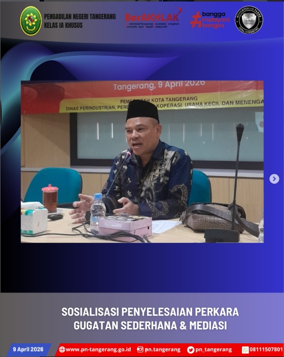 Bertempat di Oproom Gedung Cisadane Lantai IV, Ketua Pengadilan Negeri Tangerang, yang diwakili oleh Masduki hadir dalam acara Sosialisasi Penyelesaian Perkara Gugatan Sederhana & Mediasi.