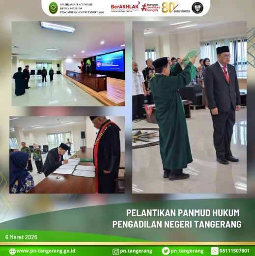 Pelantikan dan Pengambilan Sumpah Jabatan Panitera Muda Hukum Pengadilan Negeri Tangerang yang baru, Ari Prasetyo, dilaksanakan pada hari Jum’at, 06 Maret 2026, bertempat di Ruang Aula Lt.5 PN Tangerang. Ari Prasetyo diambil sumpahnya dan dilantik oleh Ketua Pengadilan Negeri Tangerang, M. Alfi Sahrin Usup. Acara ini dihadiri oleh seluruh Keluarga Besar Pengadilan Negeri Tangerang dan para tamu undangan.