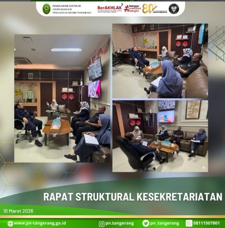 Rapat ini membahas beberapa hal penting terkait pelaksanaan kegiatan dan administrasi di lingkungan Pengadilan Negeri Tangerang, rapat ini dipimpin oleh Sekretaris, dan diikuti oleh Kepala Bagian Umum, para Kepala Sub Bagian.