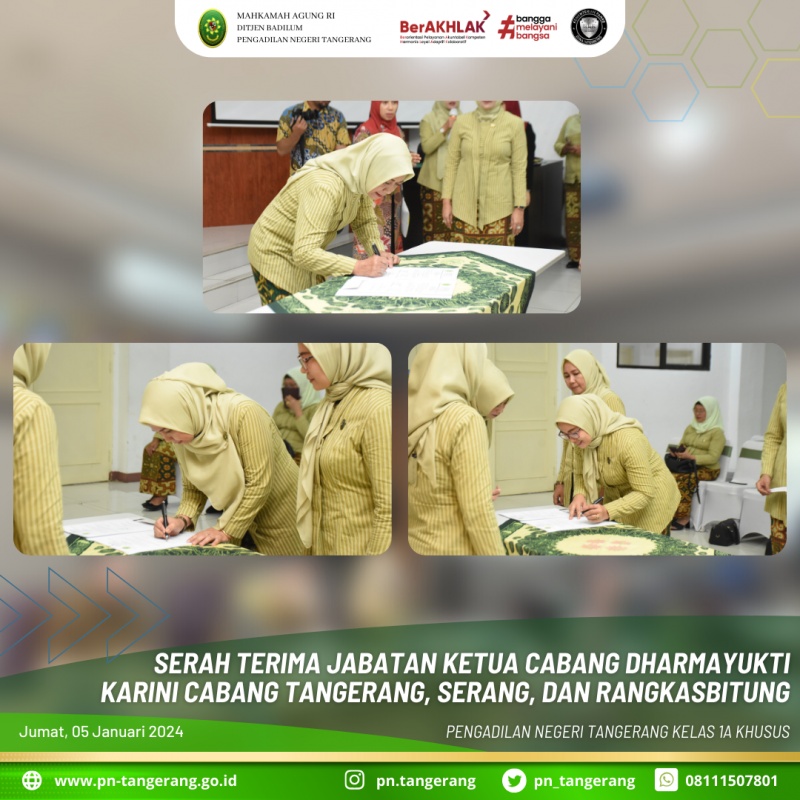 Serah Terima Jabatan yang selanjutnya disebut Sertijab adalah penyerahan dan penerimaan tentang jabatan, tanggung jawab dan wewenang dari pejabat lama kepada pejabat baru. Berdasarkan surat undangan Pengurus Daerah Dharmayukti Karini Propinsi Banten Nomor. 01/PD.DyK/1/3 tertanggal 02 Januari 2024, maka pada tanggal 05 Januari 2024, pukul 16.00 bertempat di Aula Kantor Pengadilan Tinggi Banten diadakan Serah terima Jabatan Ketua Cabang Dharmayukti Karini Cabang Tangerang, Serang dan Rangkasbitung. Acara tersebut merupakan rangkaian dari acara Pelantikan Ketua Pengadilan Negeri Tangerang, Serang dan