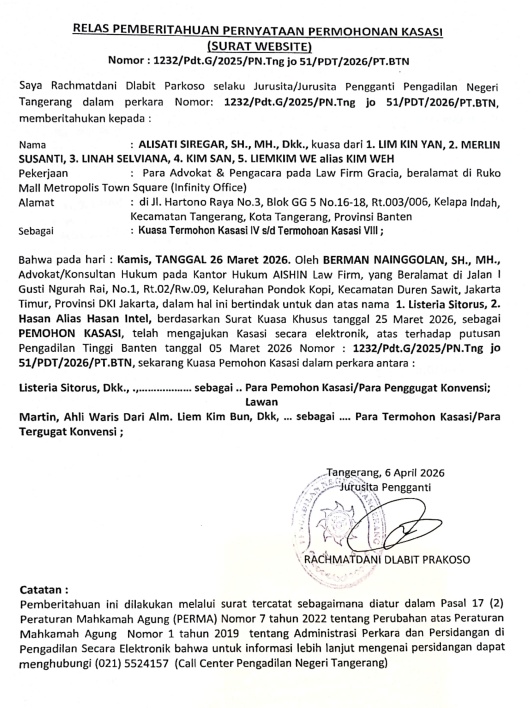 RELAS PEMBERITAHUAN PERNYATAAN PERMOHONAN KASASI (SURAT TERCATAT) NOMOR: 1232/PDT.G/2025/PN.TNG jo 51/PDT/2026/PT.BTN