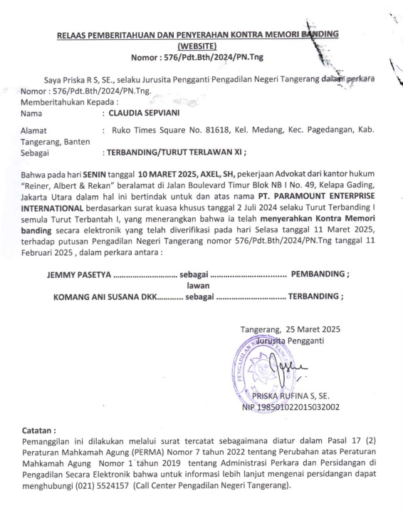 RELAAS PEMBERITAHUAN DAN PENYERAHAN MEMORI BANDING (PT.PARAMOUNT ENTERPRISE INTERNATIONAL) No. 576/Pdt.Bth/2024/PN Tng (An. CLAUDIA SEPVIANI)