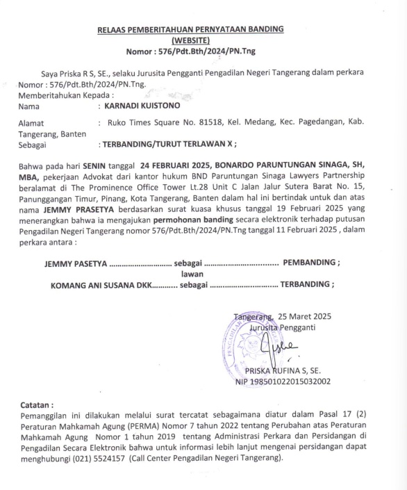 RELAAS PEMBERITAHUAN PERNYATAAN BANDING (PEMBANDING II) NO. 576/Pdt.Bth/2024/PN Tng (An. KARNADI KUISTONO)