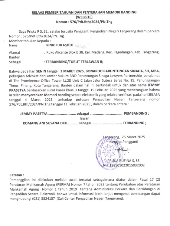 RELAAS PEMBERITAHUAN DAN PENYERAHAN MEMORI BANDING (PEMBANDING II / JEMMY PRASETYA) No. 576/Pdt.Bth/2024/PN Tng (An. NINIK PUJI ASTUTI)