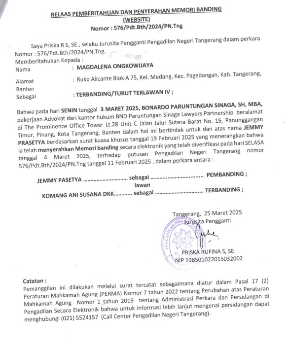 RELAAS PEMBERITAHUAN DAN PENYERAHAN MEMORI BANDING (PEMBANDING II / JEMMY PRASETYA) No. 576/Pdt.Bth/2024/PN Tng (An. MAGDALENA ONGKOWIJAYA)