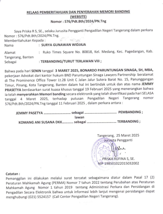 RELAAS PEMBERITAHUAN DAN PENYERAHAN MEMORI BANDING (PEMBANDING II / JEMMY PRASETYA) No. 576/Pdt.Bth/2024/PN Tng (An. SURYA GUNAWAN WIDJAJA)