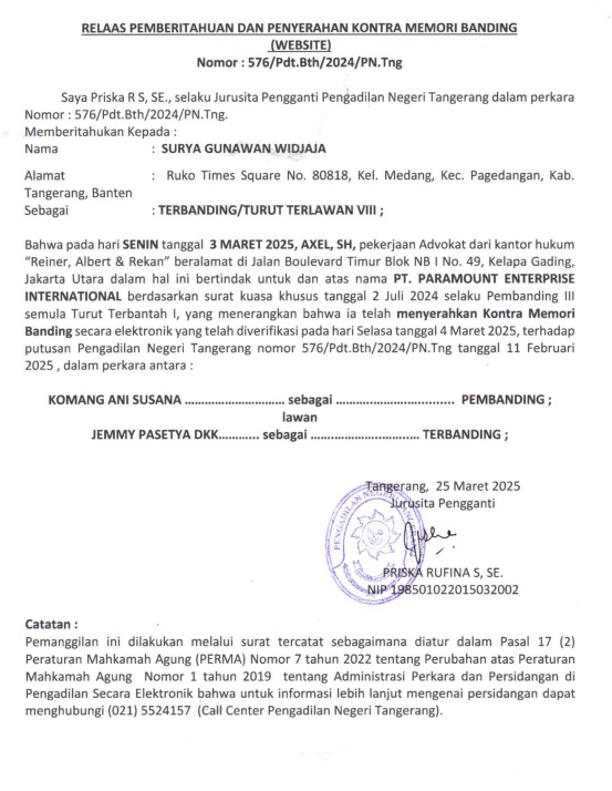 RELAAS PEMBERITAHUAN DAN PENYERAHAN KONTRA MEMORI BANDING (PT. PARAMOUNT ENTERPRISE INTERNATIONAL ) No. 576/Pdt.Bth/2024/PN Tng (An. SURYA GUNAWAN WIDJAJA)