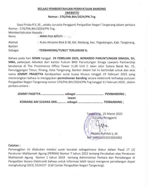 RELAAS PEMBERITAHUAN PERNYATAAN BANDING (PEMBANDING II) NO. 576/Pdt.Bth/2024/PN Tng (An. NINIK PUJI ASTUTI)