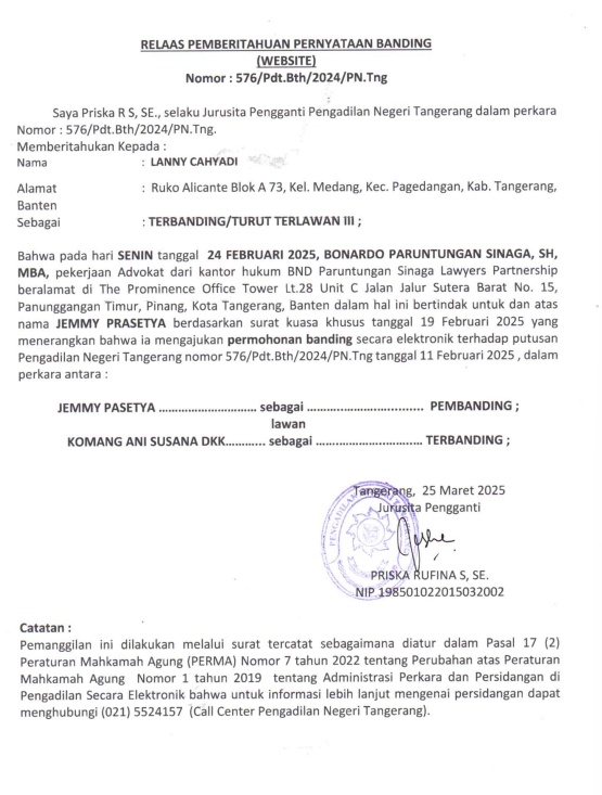 RELAAS PEMBERITAHUAN PERNYATAAN BANDING (PEMBANDING II) NO. 576/Pdt.Bth/2024/PN Tng (An. LANNY CAHYADI)