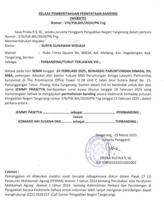 RELAAS PEMBERITAHUAN PERNYATAAN BANDING (PEMBANDING II) NO. 576/Pdt.Bth/2024/PN Tng (An. SURYA GUNAWAN WIDJAJA)