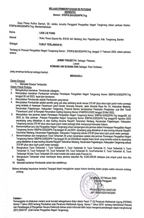 RELAAS PEMBERITAHUAN ISI PUTUSAN No. 576/PDT.BTH/2024/PN TNG (An. LIOE LIE FONG)