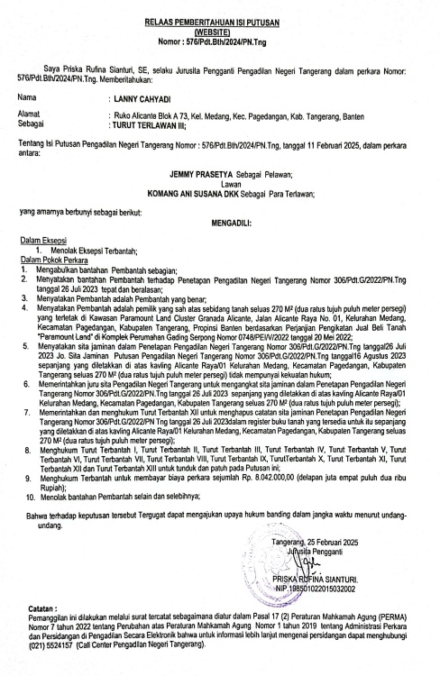 RELAAS PEMBERITAHUAN ISI PUTUSAN No. 576/PDT.BTH/2024/PN TNG (An. LANNY CAHYADI)
